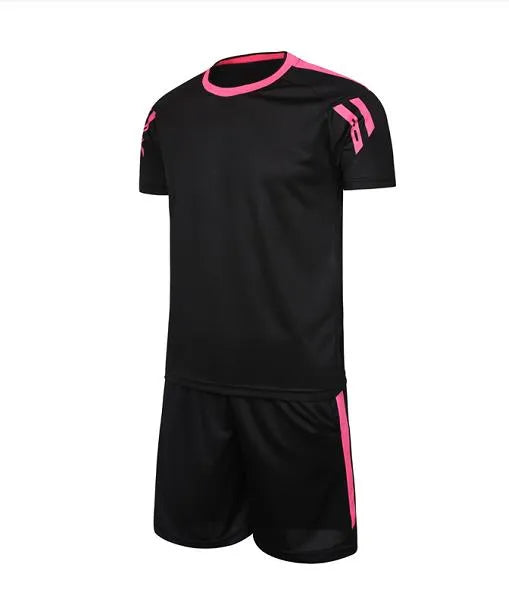 這款足球服採用了經典的黑色和粉紅色搭配,簡約時尚。設計為短袖和短褲,非常適合夏季穿著。這套足球服是由專業的設計師根據個人需求訂製而成,確保了舒適度和合身度。