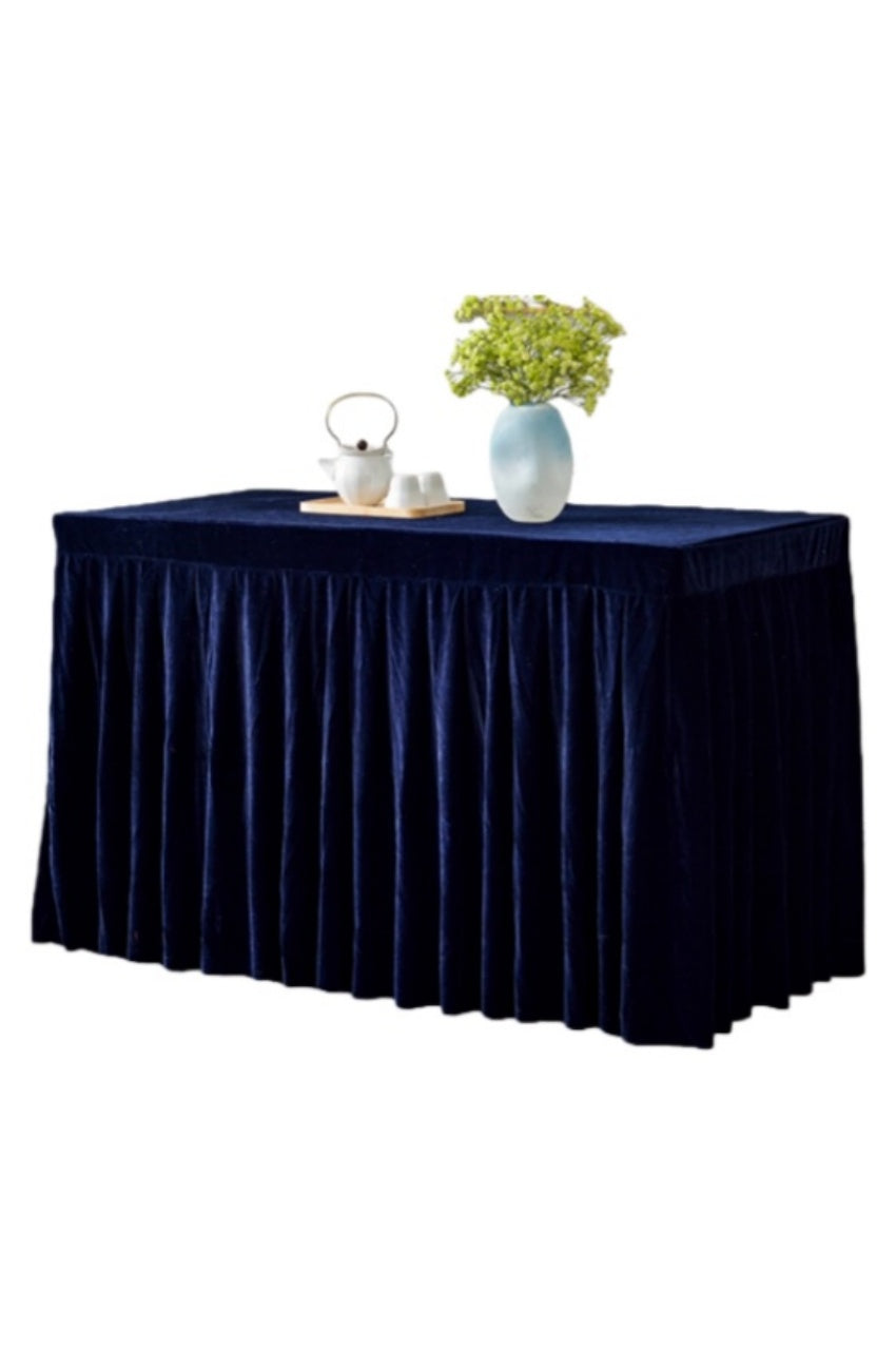 這款現貨桌罩裙,採用加厚金絲絨面料製作,觸感豐厚絲滑,垂墜感極佳,是提升任何場合格調的點睛之筆。此款深藍色版本,宛如靜謐的夜空或深邃的海洋,散發著沉穩而理性的魅力,為您的佈置增添一份專業與雅致。